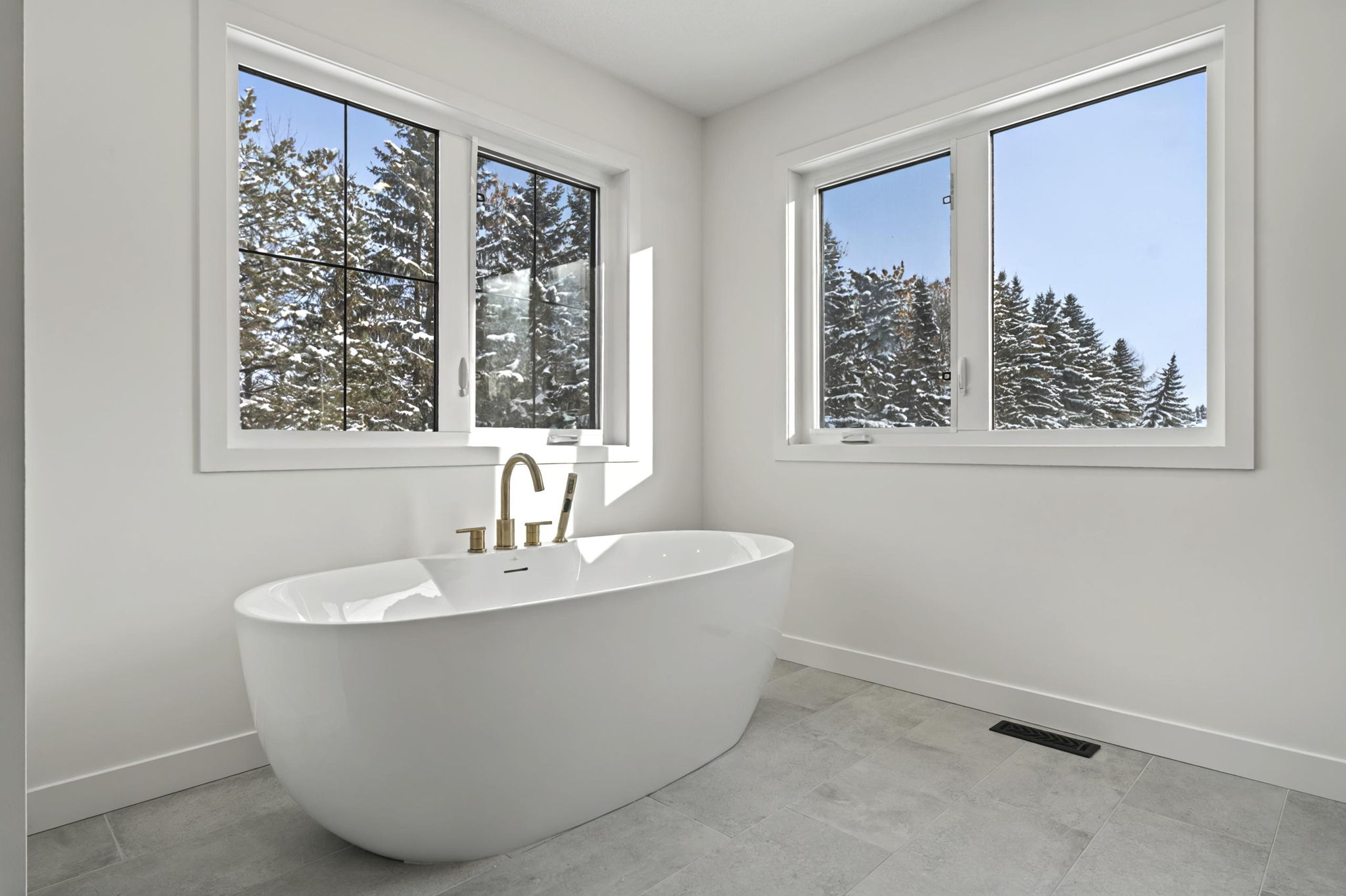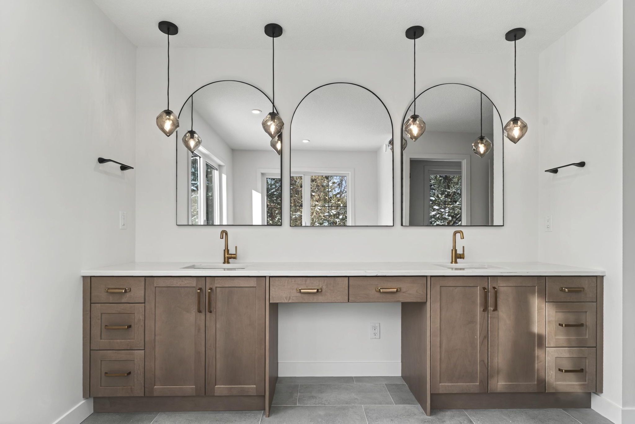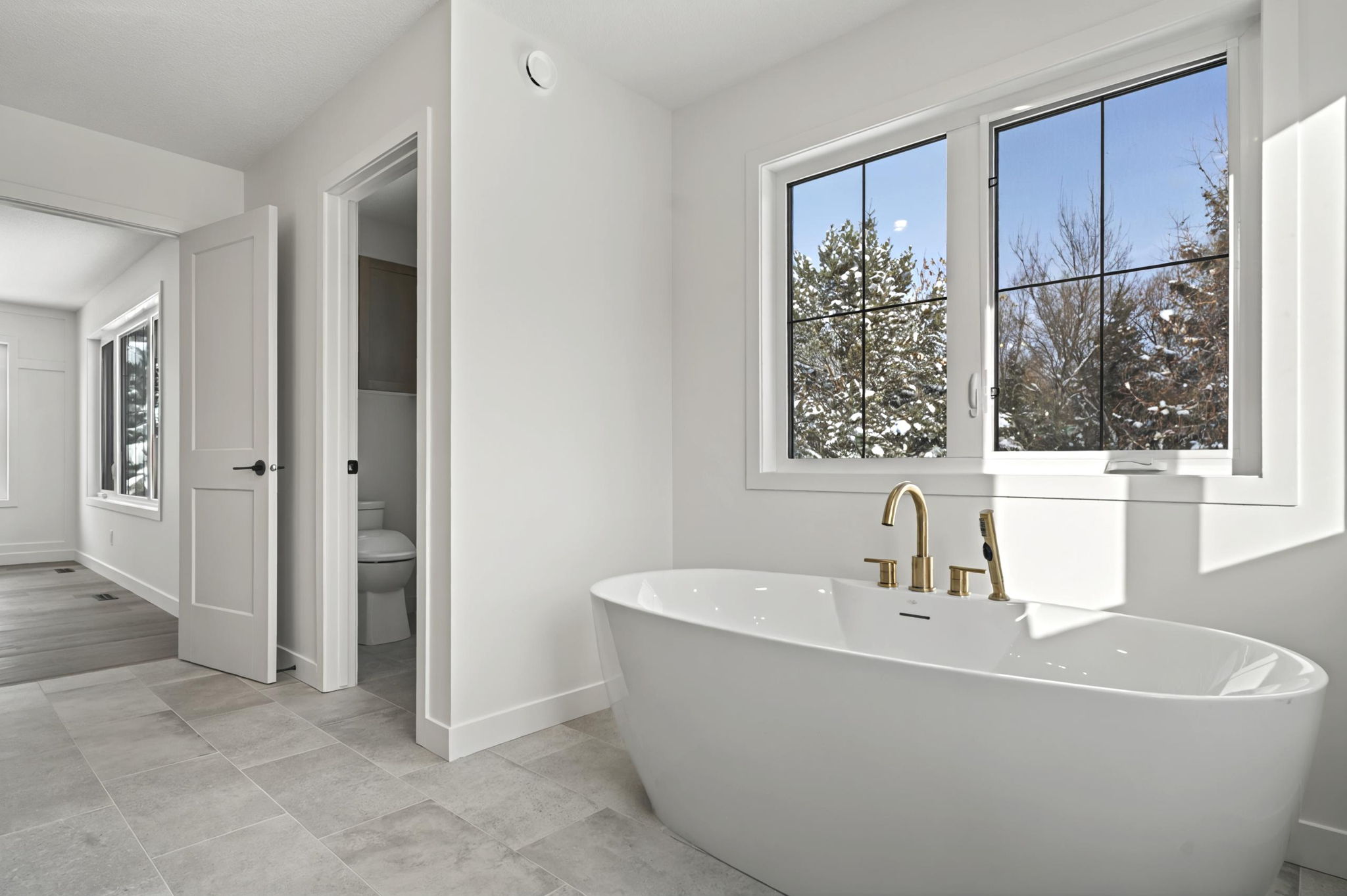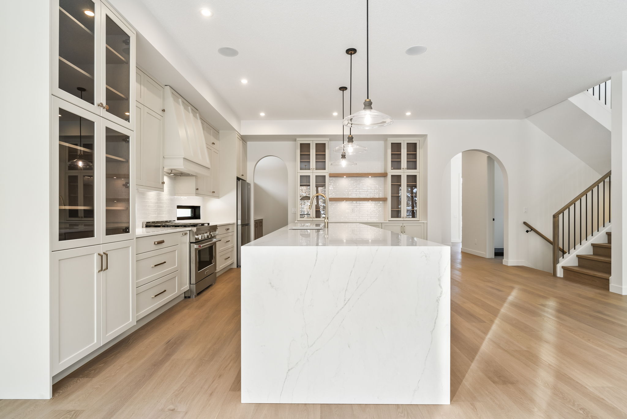 An exceptional opportunity on an estate lot in Riverside, this refined residence backs onto a natural storm pond with breathtaking views of Big Lake and coveted southwest rear exposure. Designed with architectural intention, the home features 10’ main floor ceilings, 8’ doors, full Hardie Board exterior with cedar accents, and a timeless aesthetic. Inside, the open-concept layout is finished with shaker cabinetry throughout, 9’ kitchen cabinets with crown moulding, hutch cabinetry with glass, quartz backsplash, upgraded hood fan, and a premium KitchenAid appliance package. Thoughtful details include silgranit sinks paired with elegant gold fixtures, stained railings, an upgraded lighting package, a glass door enclosed den, and a striking plaster fireplace feature. The primary ensuite offers spa-inspired finishes with custom mirrors, gold plumbing, a tiled niche, and upgraded tilework. Enjoy peaceful evenings on the covered deck overlooking water and nature. Ideally located steps from Lois Hole Provincial Park, extensive trail systems, downtown St. Albert, and convenient Anthony Henday access.