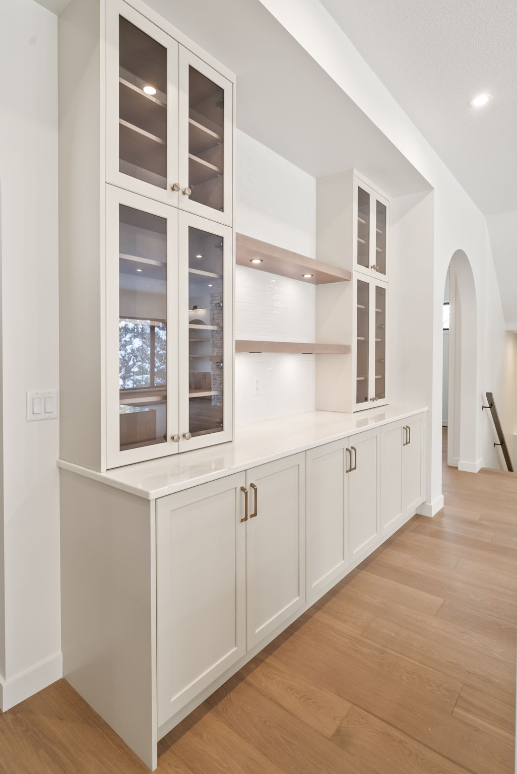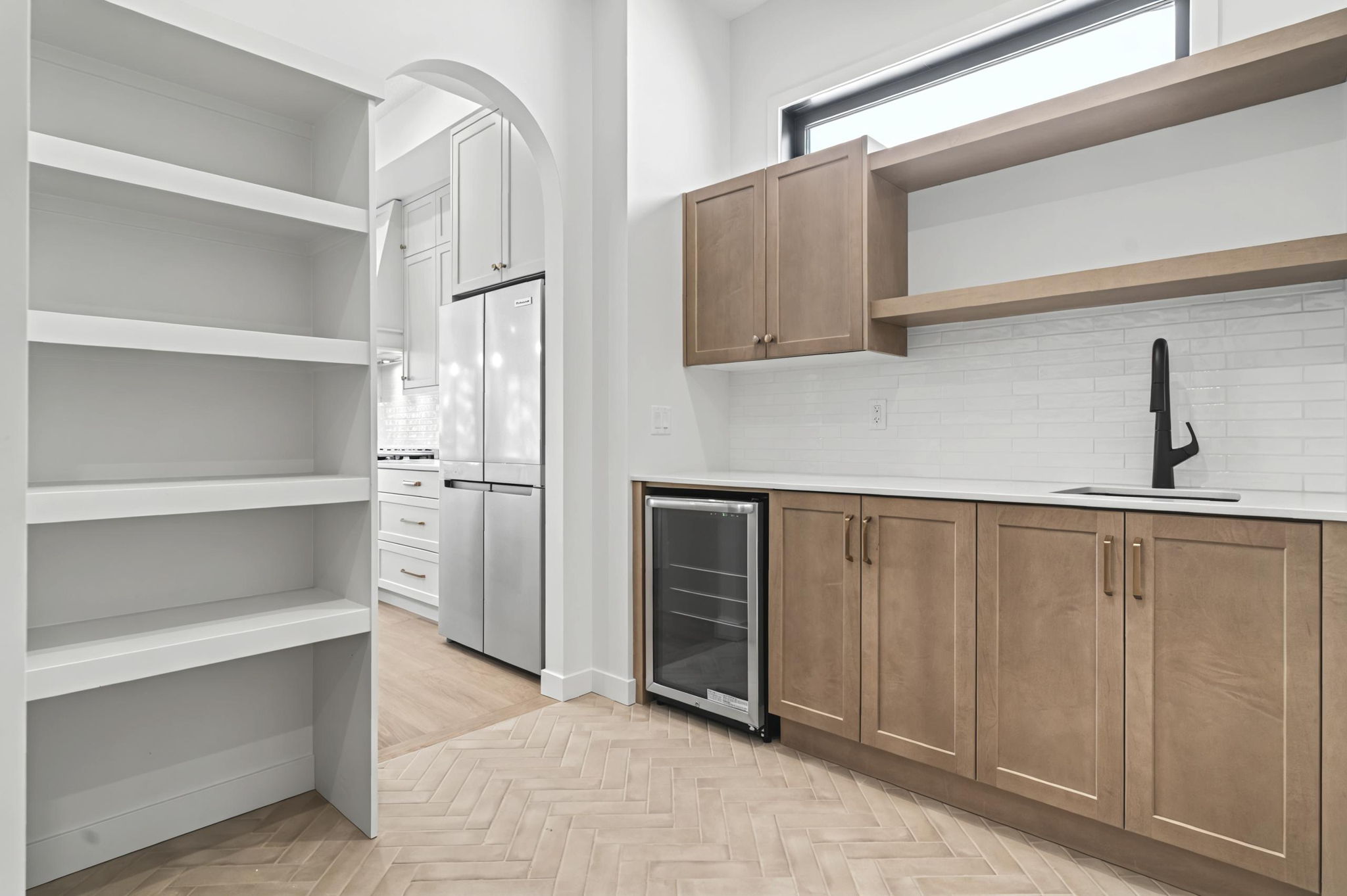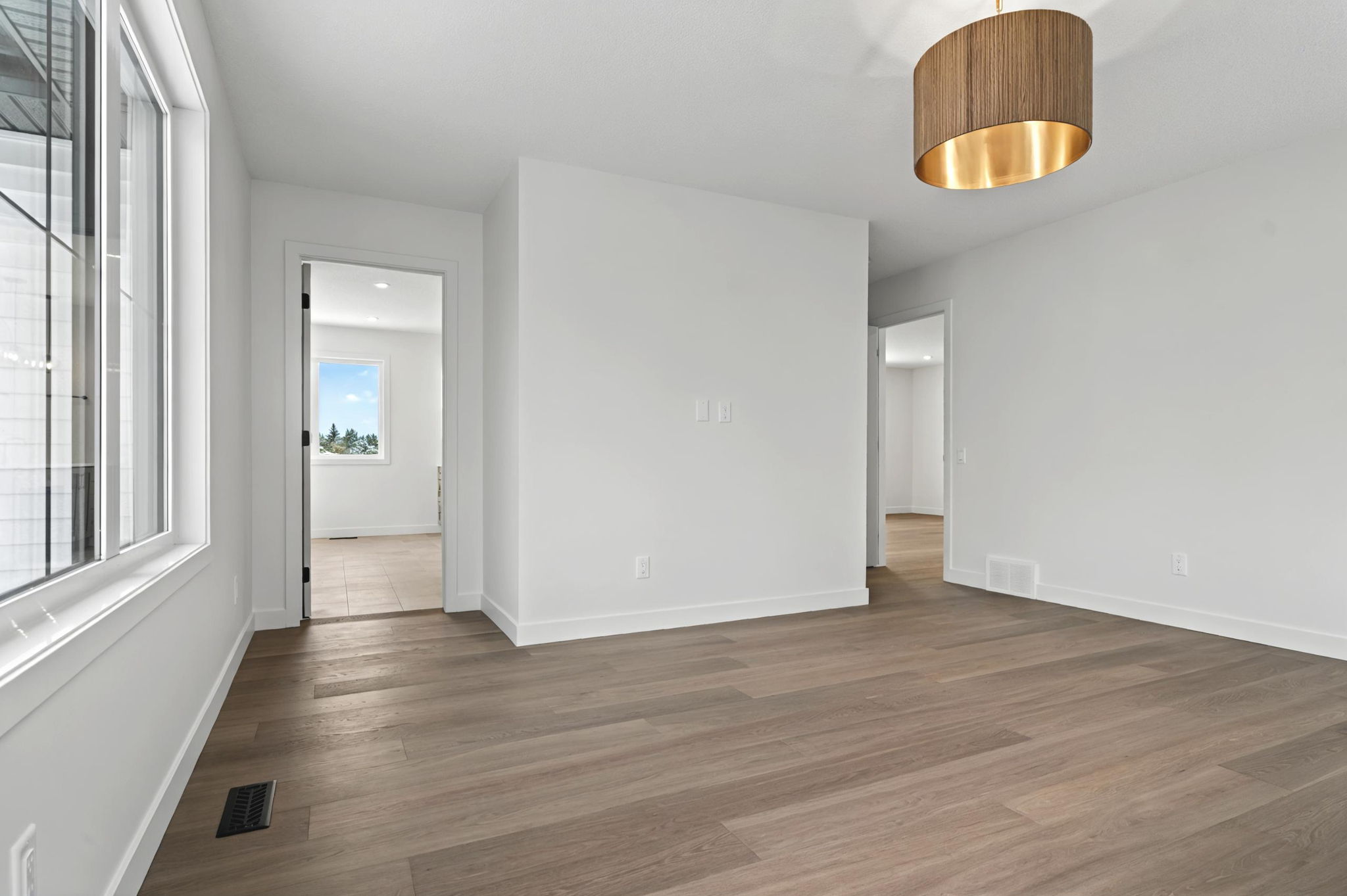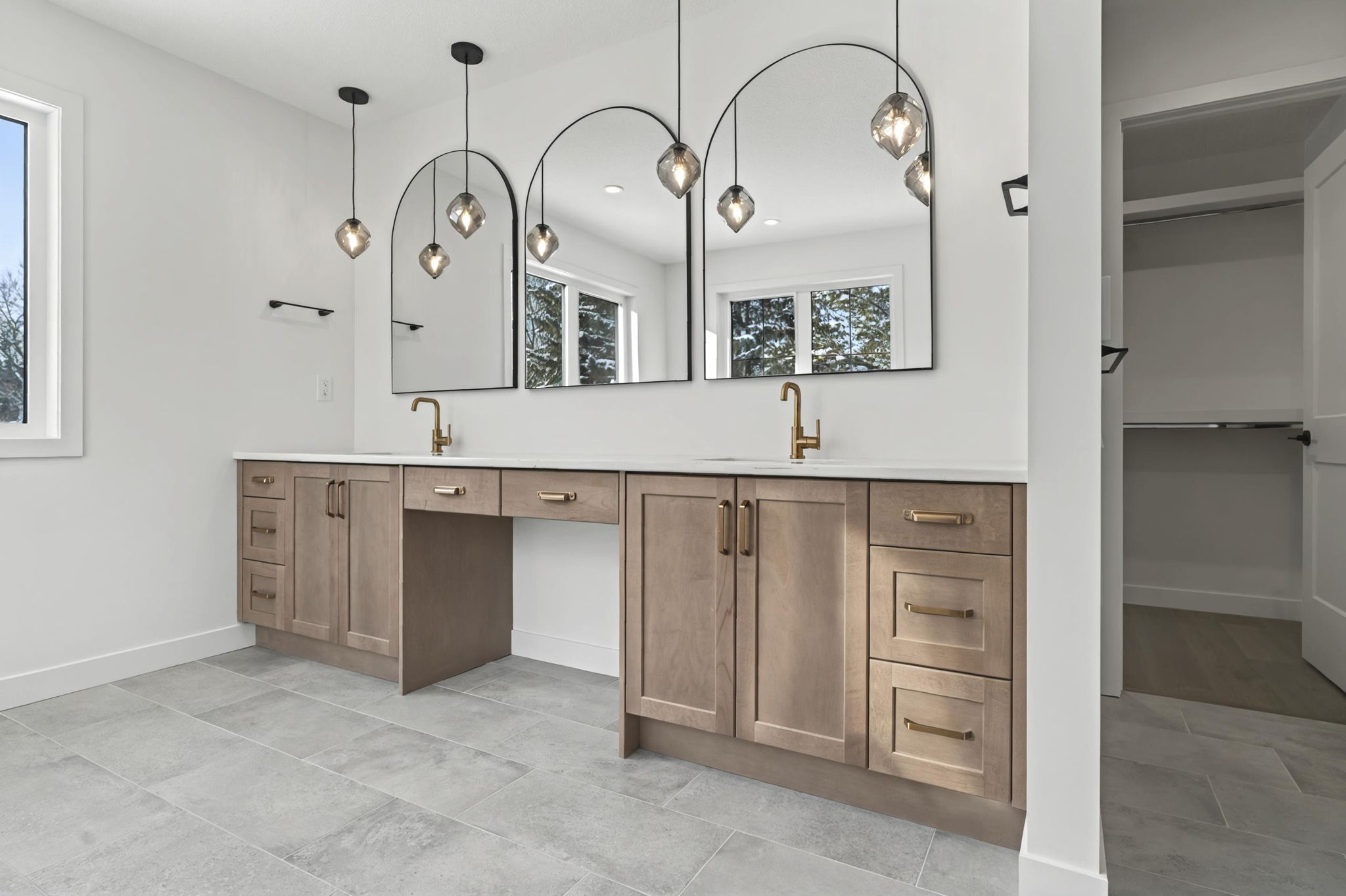 An exceptional opportunity on an estate lot in Riverside, this refined residence backs onto a natural storm pond with breathtaking views of Big Lake and coveted southwest rear exposure. Designed with architectural intention, the home features 10’ main floor ceilings, 8’ doors, full Hardie Board exterior with cedar accents, and a timeless aesthetic. Inside, the open-concept layout is finished with shaker cabinetry throughout, 9’ kitchen cabinets with crown moulding, hutch cabinetry with glass, quartz backsplash, upgraded hood fan, and a premium KitchenAid appliance package. Thoughtful details include silgranit sinks paired with elegant gold fixtures, stained railings, an upgraded lighting package, a glass door enclosed den, and a striking plaster fireplace feature. The primary ensuite offers spa-inspired finishes with custom mirrors, gold plumbing, a tiled niche, and upgraded tilework. Enjoy peaceful evenings on the covered deck overlooking water and nature. Ideally located steps from Lois Hole Provincial Park, extensive trail systems, downtown St. Albert, and convenient Anthony Henday access.