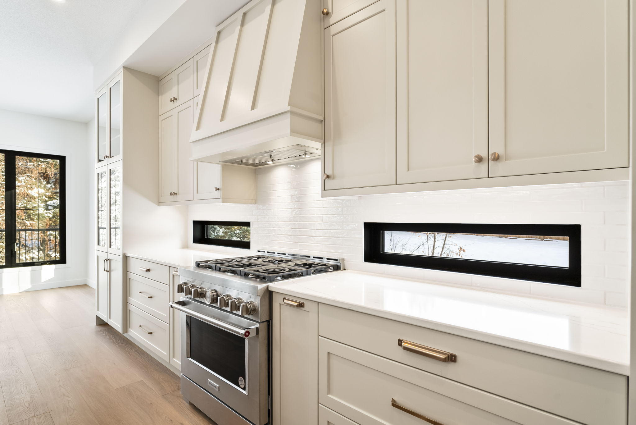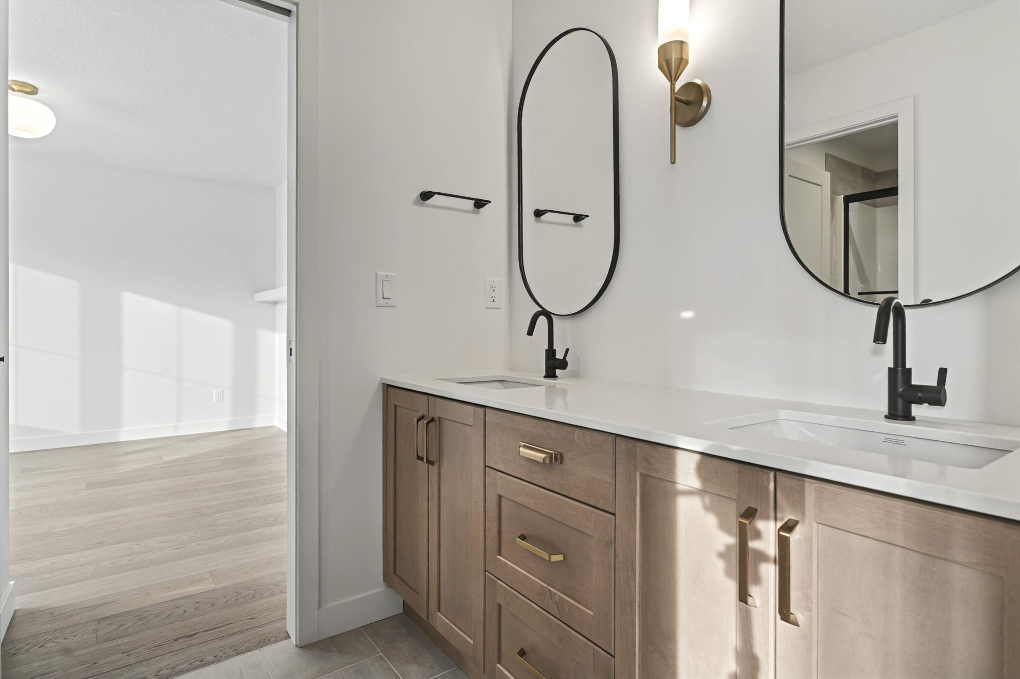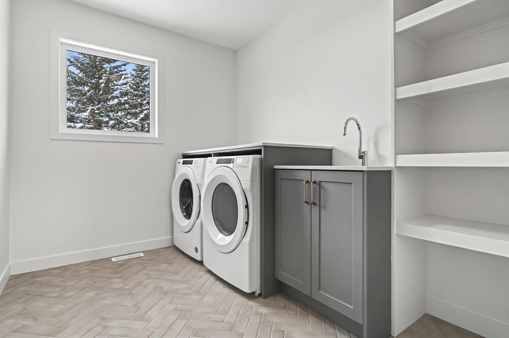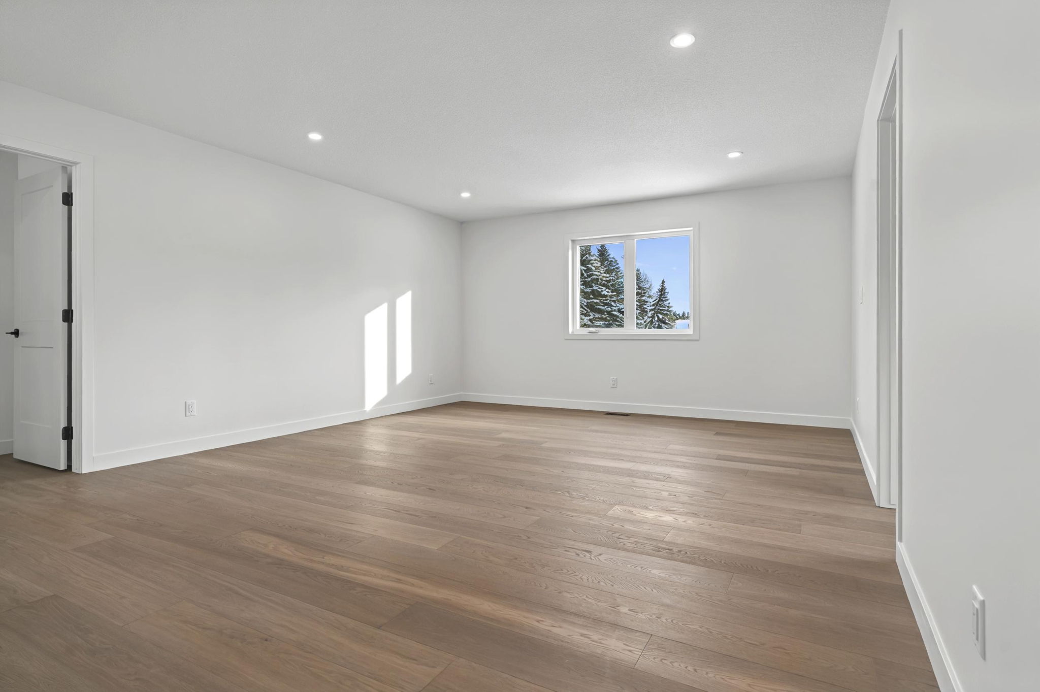 An exceptional opportunity on an estate lot in Riverside, this refined residence backs onto a natural storm pond with breathtaking views of Big Lake and coveted southwest rear exposure. Designed with architectural intention, the home features 10’ main floor ceilings, 8’ doors, full Hardie Board exterior with cedar accents, and a timeless aesthetic. Inside, the open-concept layout is finished with shaker cabinetry throughout, 9’ kitchen cabinets with crown moulding, hutch cabinetry with glass, quartz backsplash, upgraded hood fan, and a premium KitchenAid appliance package. Thoughtful details include silgranit sinks paired with elegant gold fixtures, stained railings, an upgraded lighting package, a glass door enclosed den, and a striking plaster fireplace feature. The primary ensuite offers spa-inspired finishes with custom mirrors, gold plumbing, a tiled niche, and upgraded tilework. Enjoy peaceful evenings on the covered deck overlooking water and nature. Ideally located steps from Lois Hole Provincial Park, extensive trail systems, downtown St. Albert, and convenient Anthony Henday access.